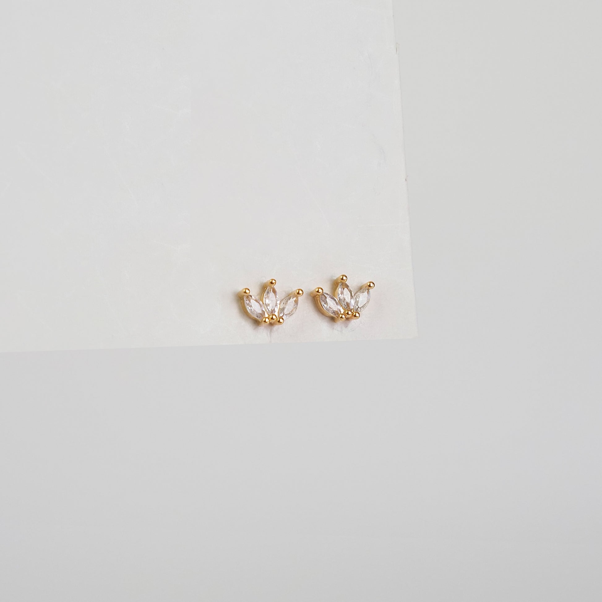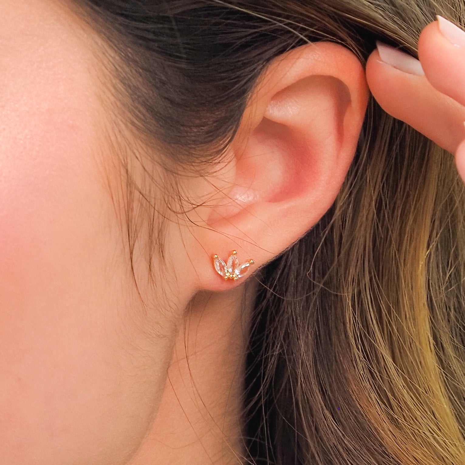 Conheça o brinco semijoia três navetes dourado, uma peça pequena e super estilosa, banhada com 10 camadas de ouro amarelo 18K. Leve e confortável, é perfeito para usar o dia inteiro. O fechamento com tarraxa mantém o brinco firme e seguro. Com seu tamanho versátil, é ideal para usar também no segundo furo, permitindo criar combinações outros brincos da Margê Atelier.