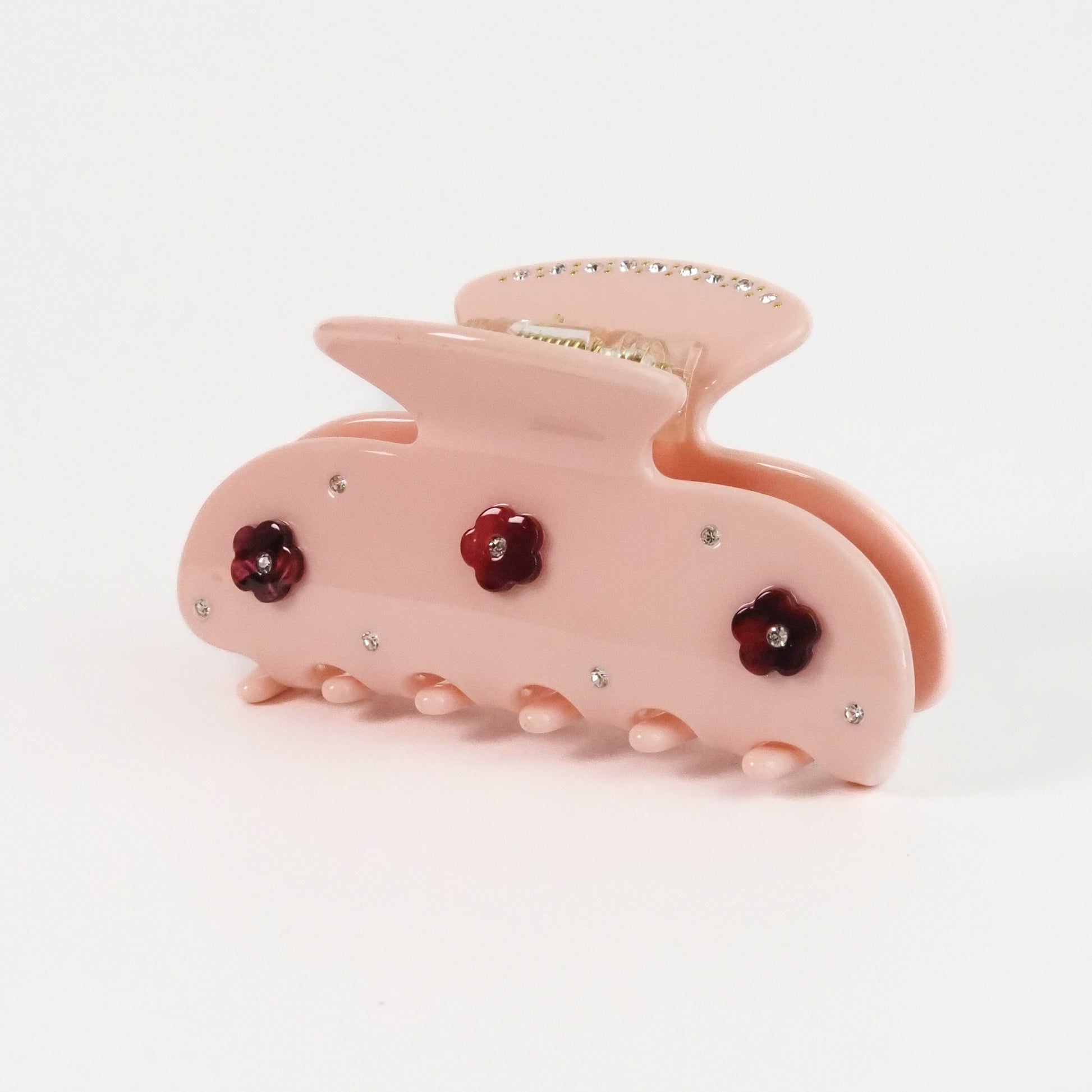 Possui brilhos alem de 3 florzinhas de acetato no tom de vinho.