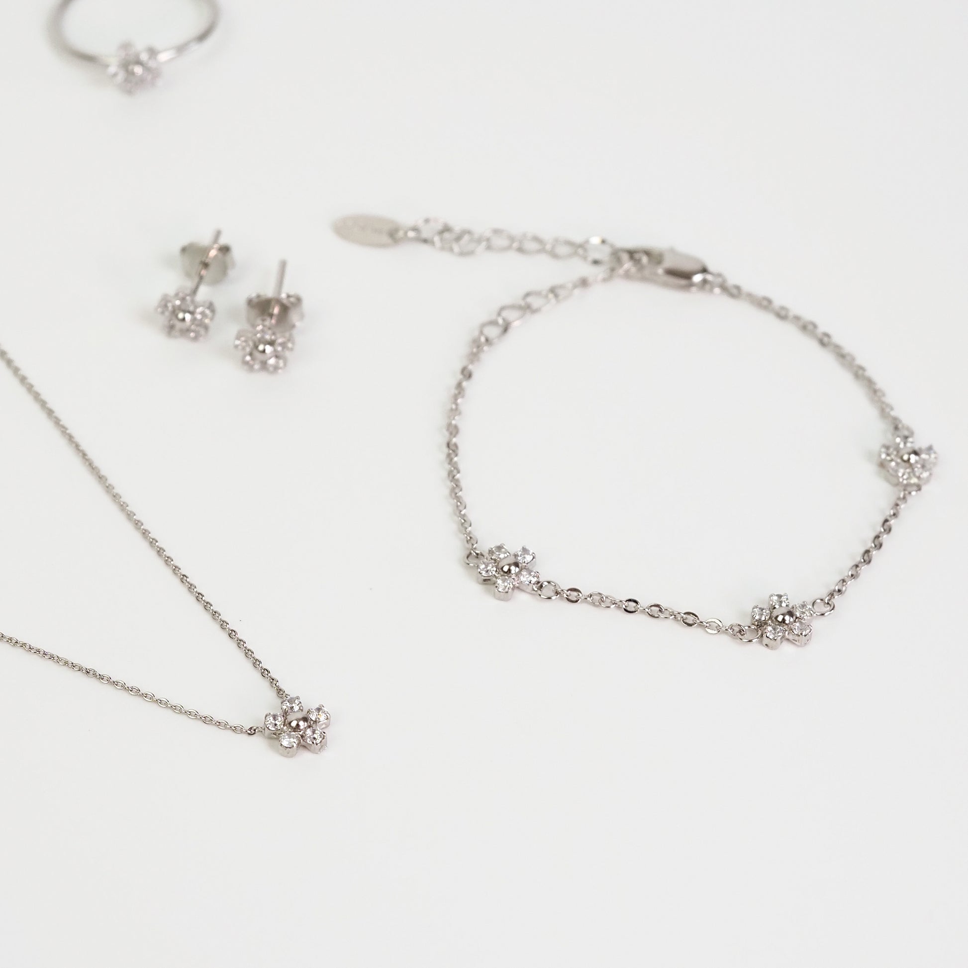 Nossa pulseira flor zirconia prateada é a semijoia perfeita para o dia a dia. Banhada em ródio branco e com zirconias formando 3 flores. Uma peça delicada, livre de níquel e hipoalergênica, garantindo total conforto e durabilidade. Perfeita para combinar com outras peças da Margê Atelier, ela adiciona um toque elegante ao seu visual, seja para um look casual ou ocasiões especiais.