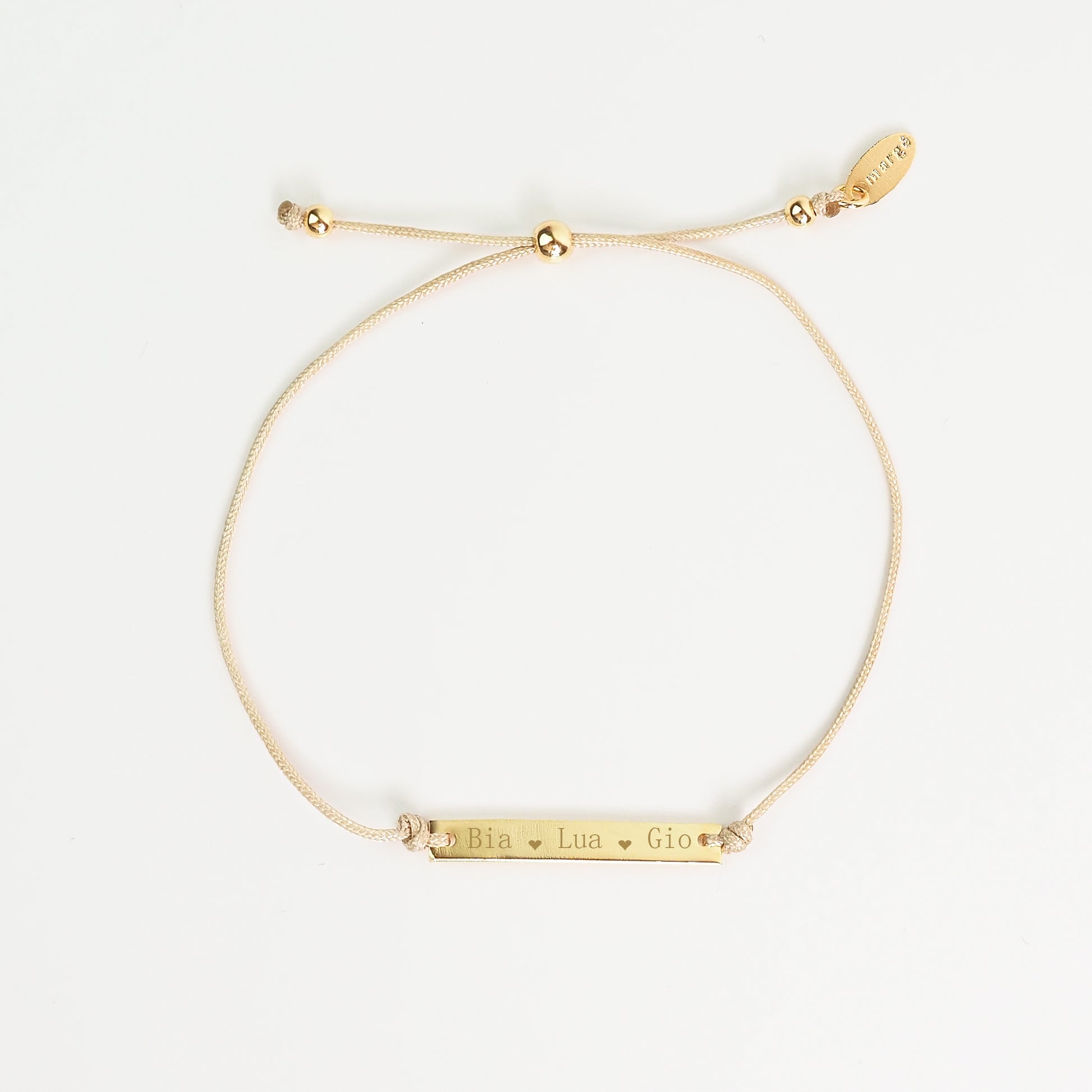A pulseira pode ser feito com até 14 caracteres. É uma semijoia banhada em 10 camadas de ouro amarelo 18k, antialérgico e com 1 ano de garantia. Ela é um modelo ajustável feito com fita de seda, é o presente perfeito ✨ por ser um produto feito especialmente para você não aceitaremos trocas ou devolução.