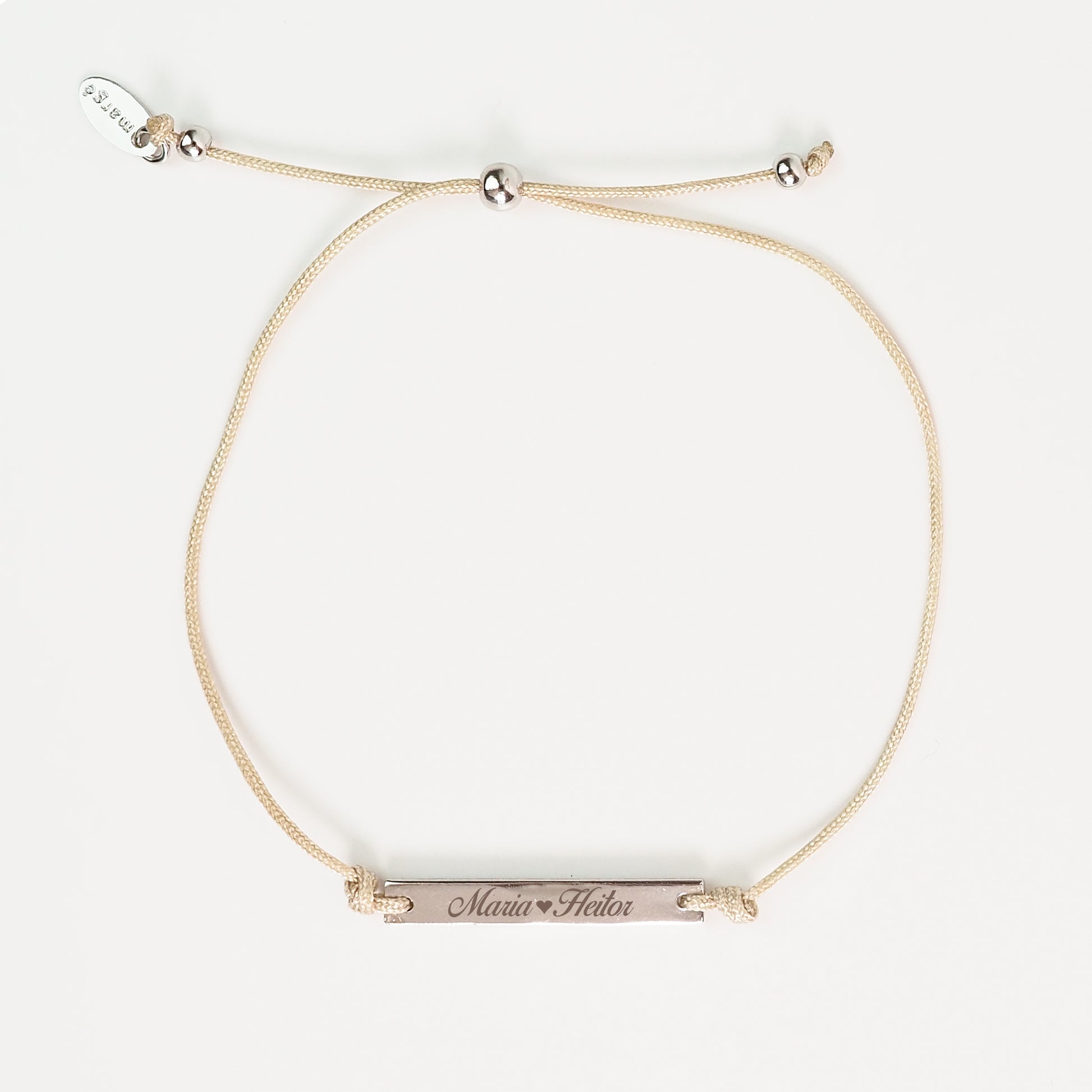 A pulseira pode ser feito com até 14 caracteres. É uma semijoia banhada em ródio branco, antialérgico e com 1 ano de garantia. Ela é um modelo ajustável feito com fita de seda, é o presente perfeito ✨ por ser um produto feito especialmente para você não aceitaremos trocas ou devolução.